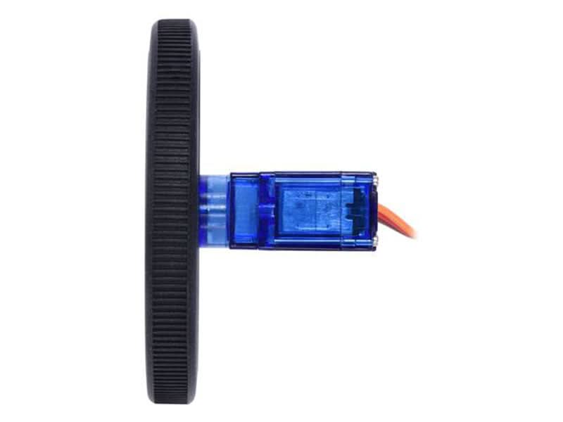 This pair of wheels is designed specifically for use with micro continuous rotation servos SG90 MG90S SG92R, and the combination can serve as a small, inexpensive, and easy-to-control drive system for a miniature robot. The wheel presses onto the servo spline just like a typical servo horn, using a small screw to hold the wheel in place.